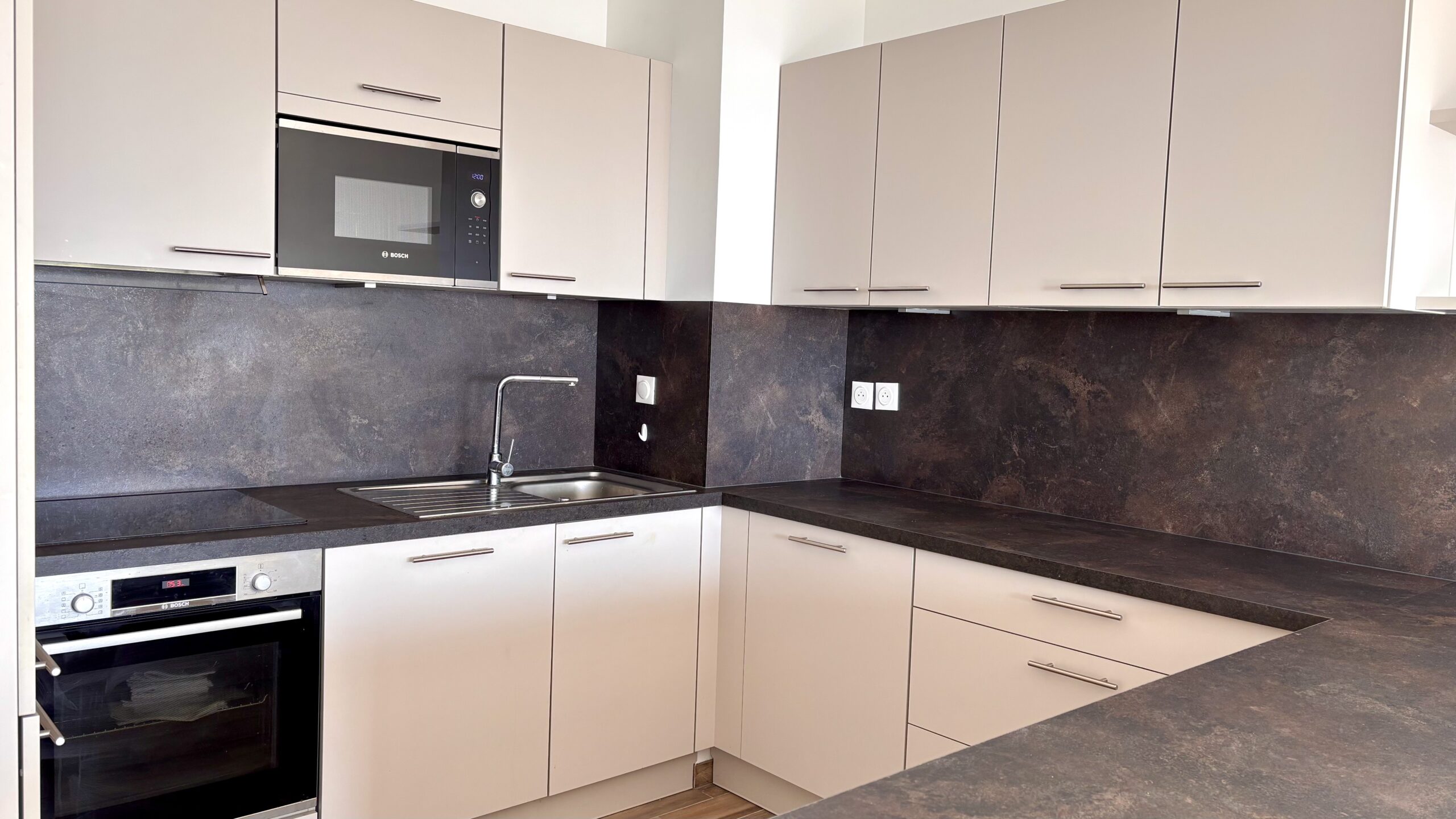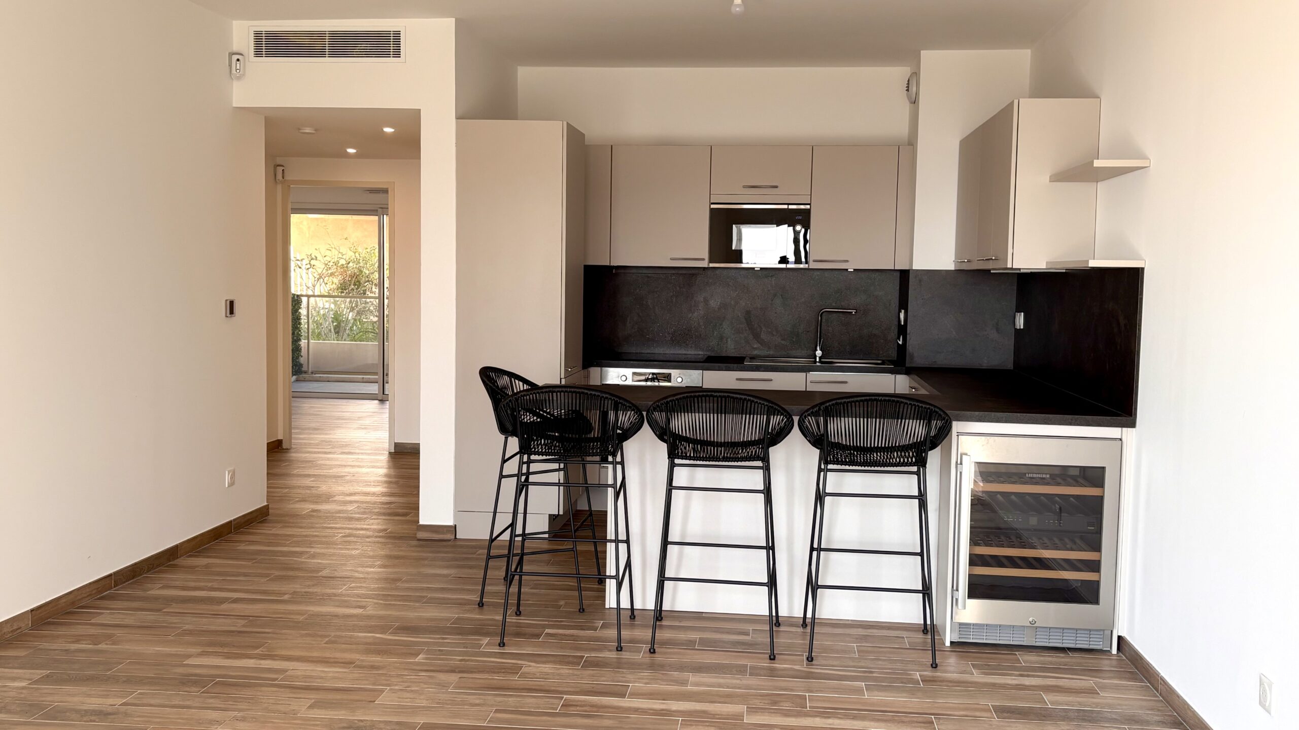 The main living room of more than 32 m² (350 sq ft) is organized with remarkable fluidity, combining a spacious living room and a kitchen with clean lines. Fully equipped with high-quality Bosch appliances, it also has a built-in wine cellar, highlighting meticulous attention to detail. This space opens generously onto two private terraces totalling 21.5 m² (231 sq ft), inviting you to savor the mild climate of the Côte d'Azur in front of the immensity of the sea.