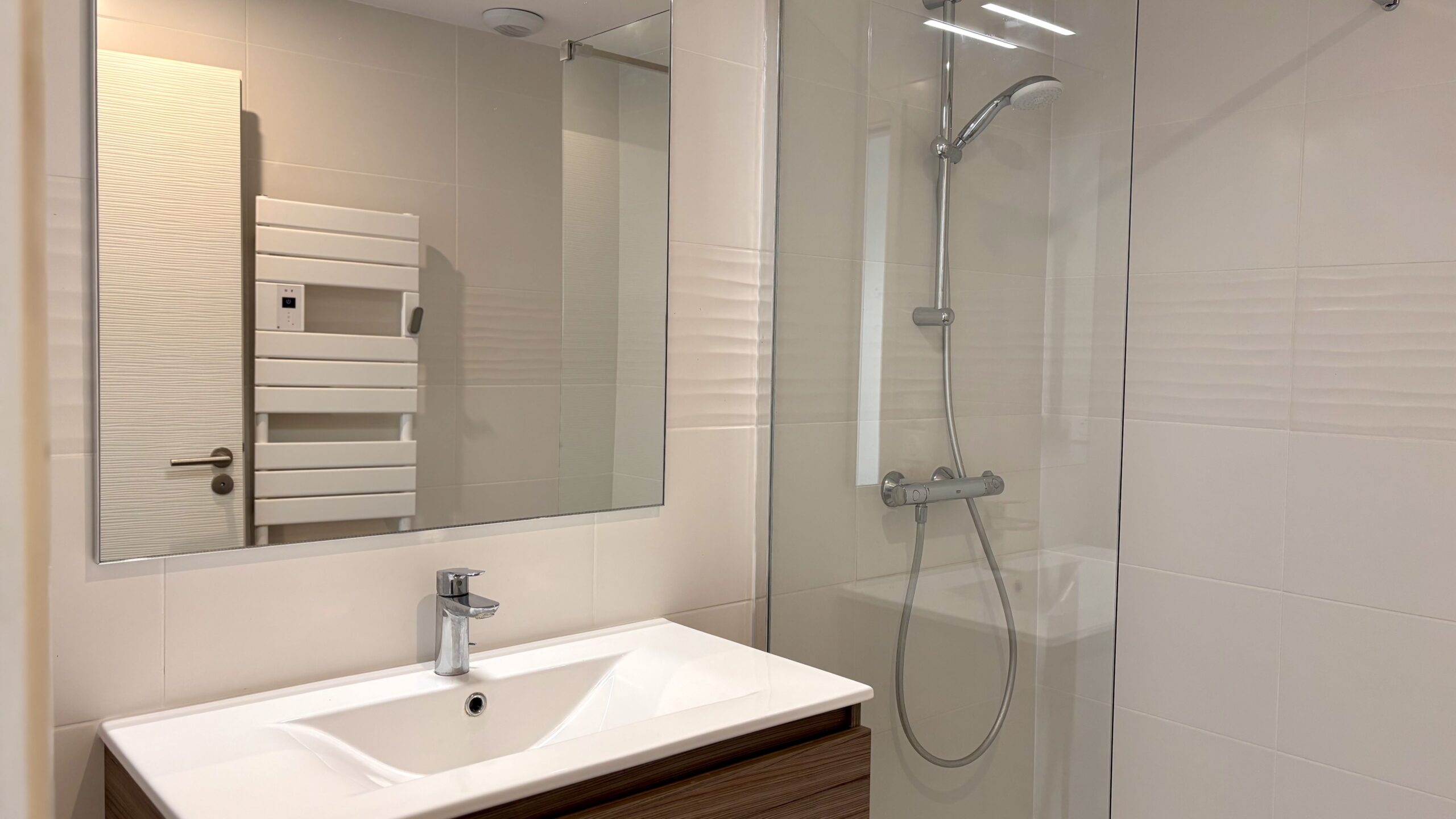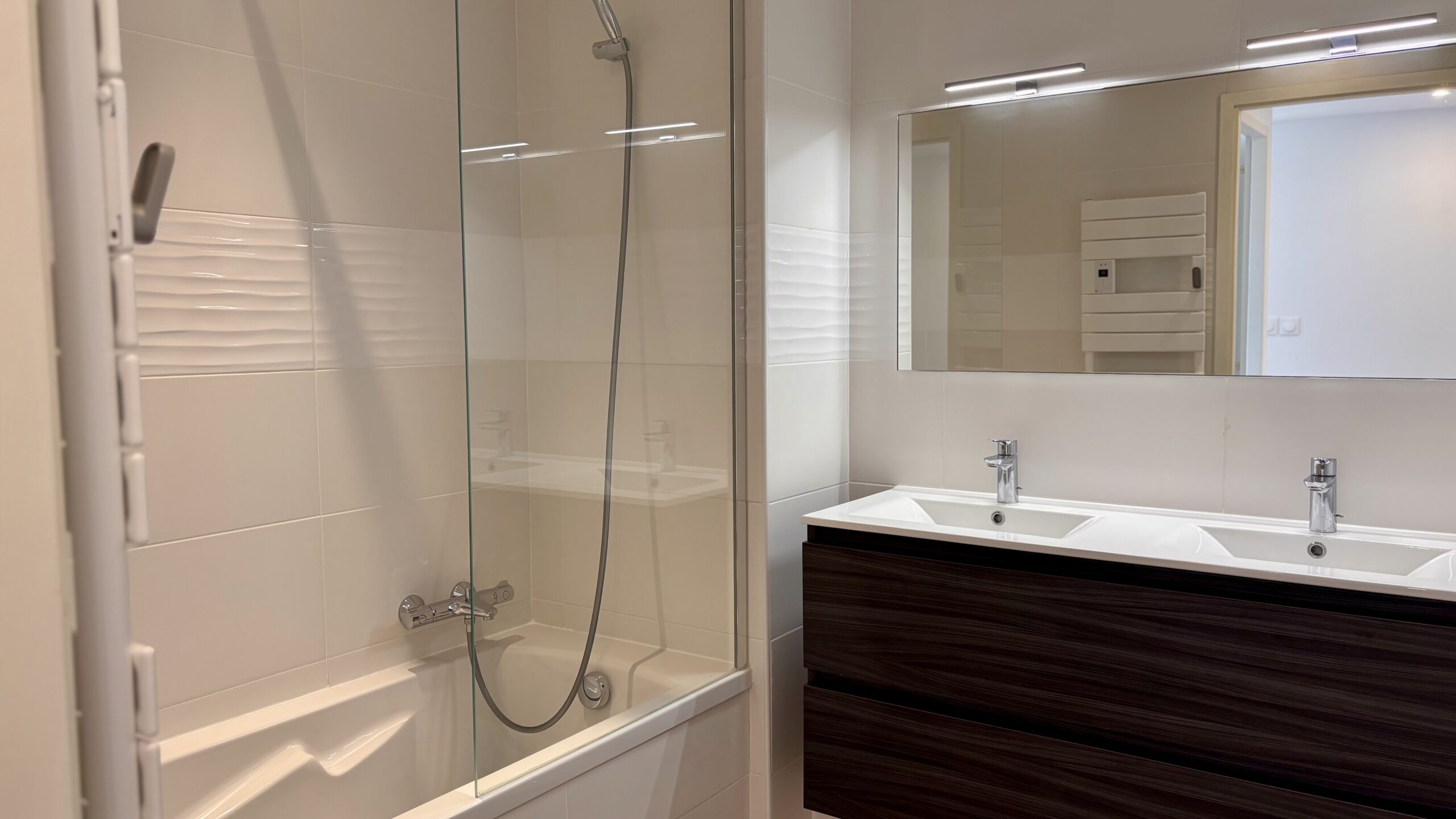 Private neighbourhoods are designed as true havens of peace. Two generous bedrooms of 15.5 m² and 14.5 m² offer calm and refinement for peaceful nights. For optimal daily comfort, the property has two separate bathrooms, one with a bathtub and the other with a spacious walk-in shower, complemented by a separate toilet.